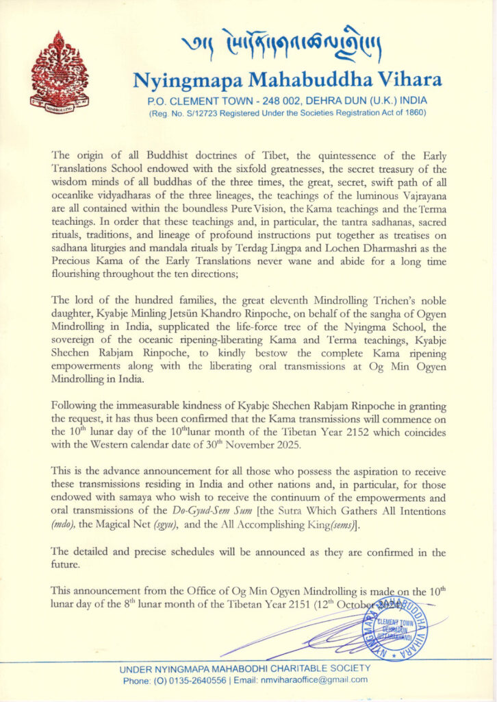 Announcing the Kama Transmissions To Be Bestowed by Kyabje Shechen Rabjam Rinpoche at Mindrolling Monastery – 2025 October 12, 2024