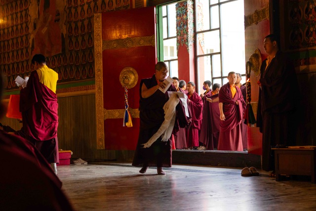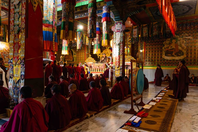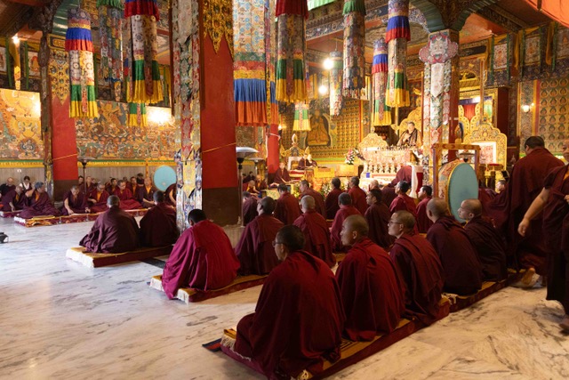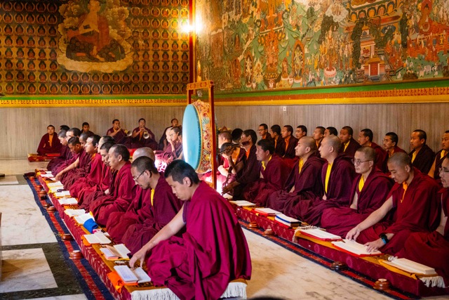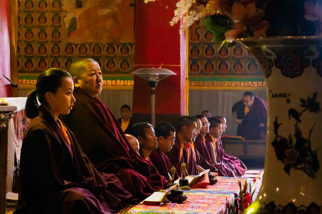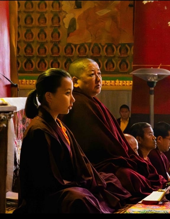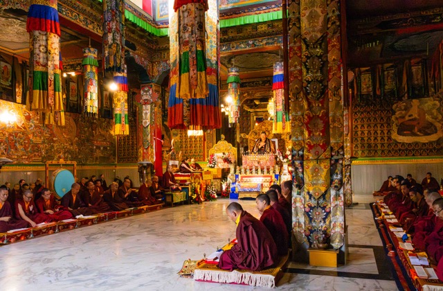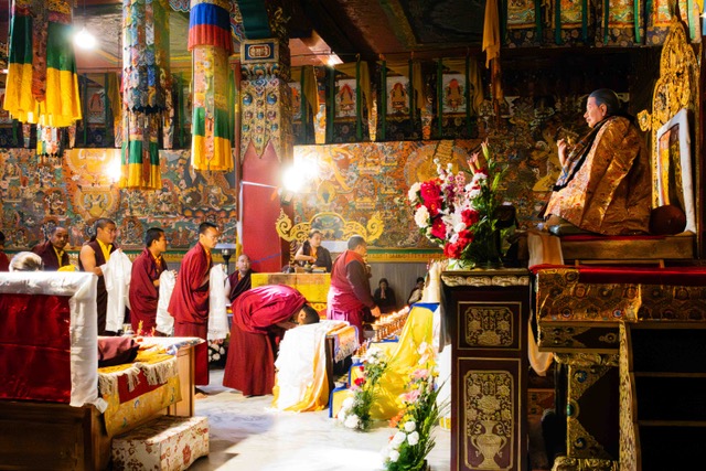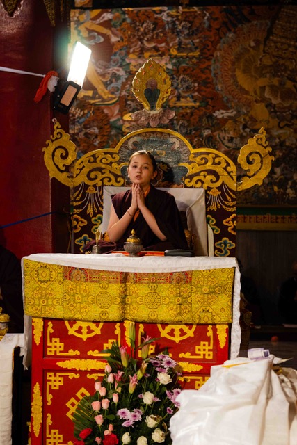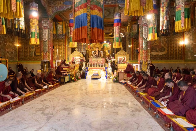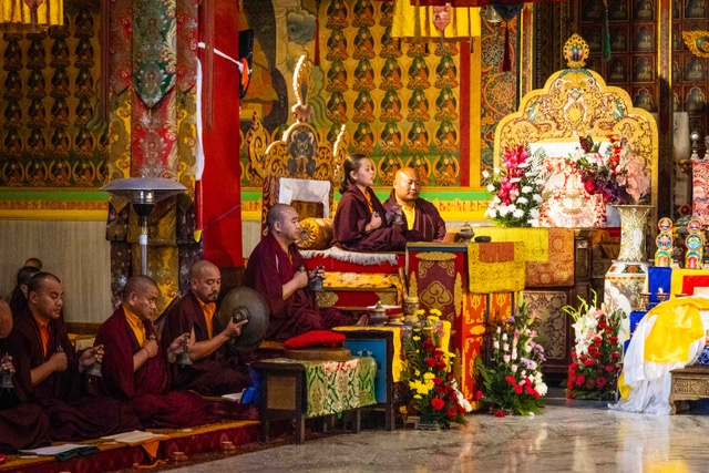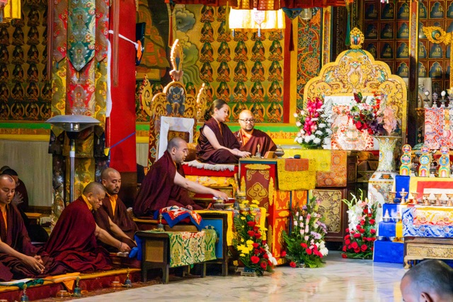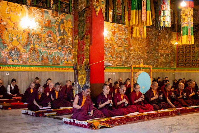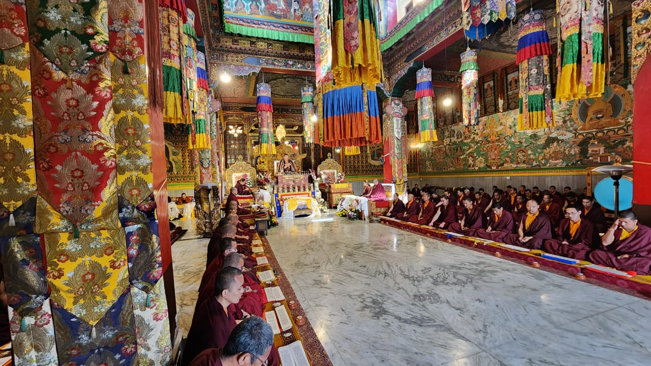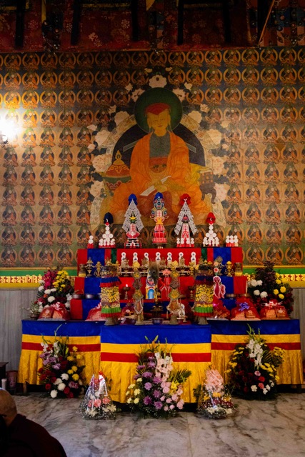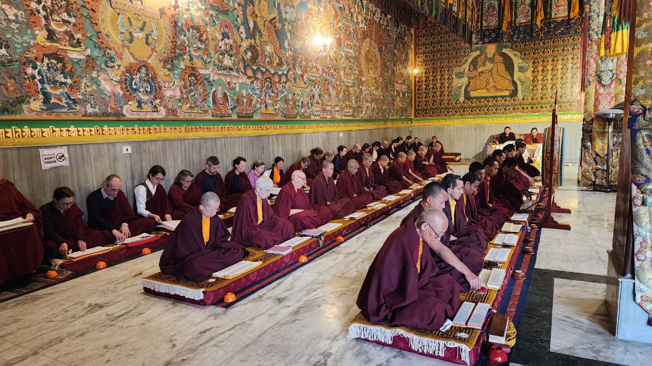 The 3rd day of the 1st lunar month of the Year of the Wood Dragon (February 12th, 2024) marked the 16th anniversary of the parinirvana of Kyabje Minling Trichen. The parinirvana day this year was an especially auspicious one because it marked the installation of the Draku of Kyabje Minling Trichen in the main shrine room. The sangha joyfully engaged in sadhana practice in the presence of this inspiring and sacred representation of the Guru and everyone present felt that the draku invoked a deep sense of “liberation upon seeing.” The day was further enriched by the presence of Minling Dungse Rinpoche and Minling Jetsün Rinpoche who joined the gathered sangha of tulkus, khenpos, monks, nuns and Western students for the entire practice of the profound Rigzin Thugthig Sadhana. With the presence of the sacred image of the glorious Guru, the two young Rinpoches and the precious gathered assembly, the entire shrine room resonated with sublime blessings and joy. With heartfelt devotion, the sangha made extensive prayers and supplications for the increase of Dharma, the flourishing of the Mindrolling lineage, and the perfection of the two accumulations of merit and wisdom for all beings.
