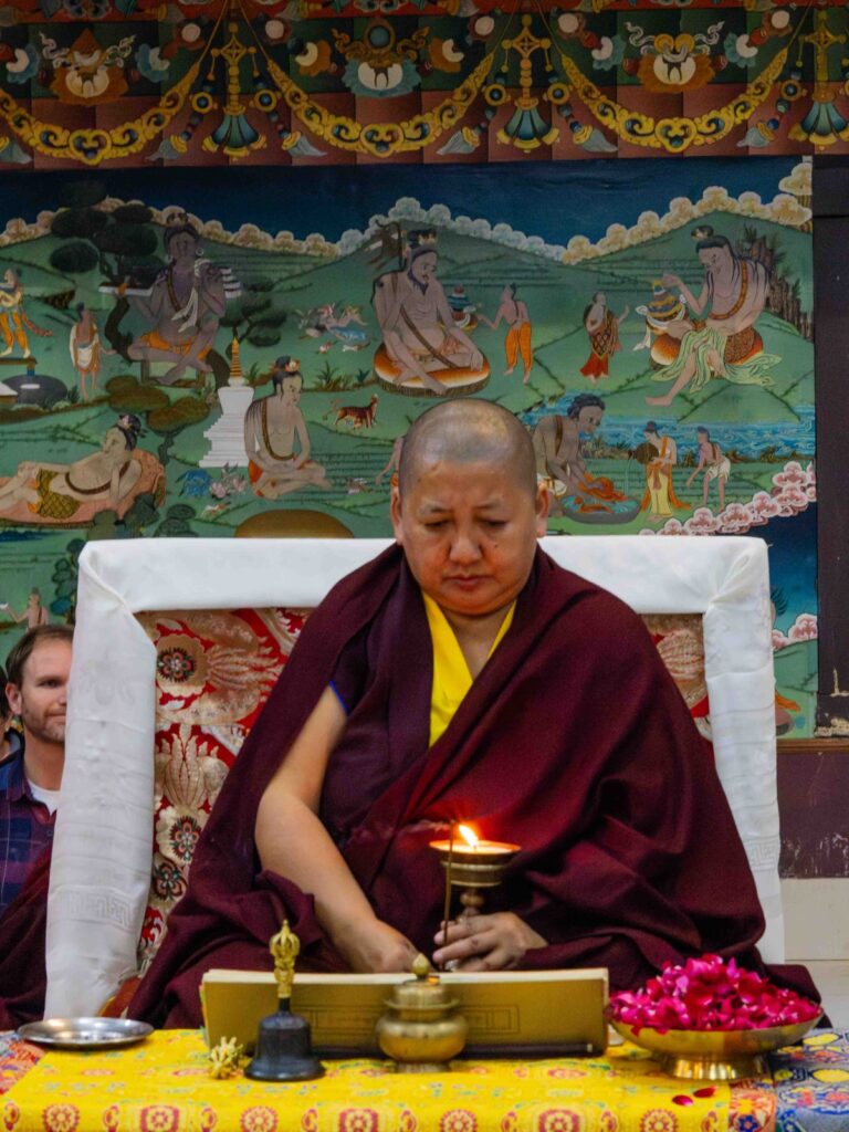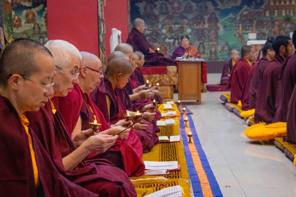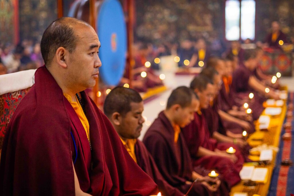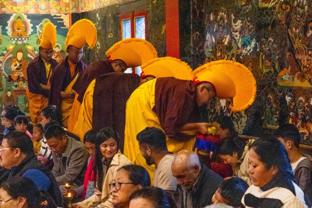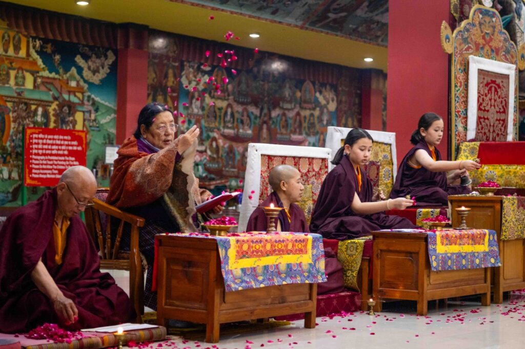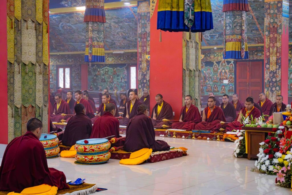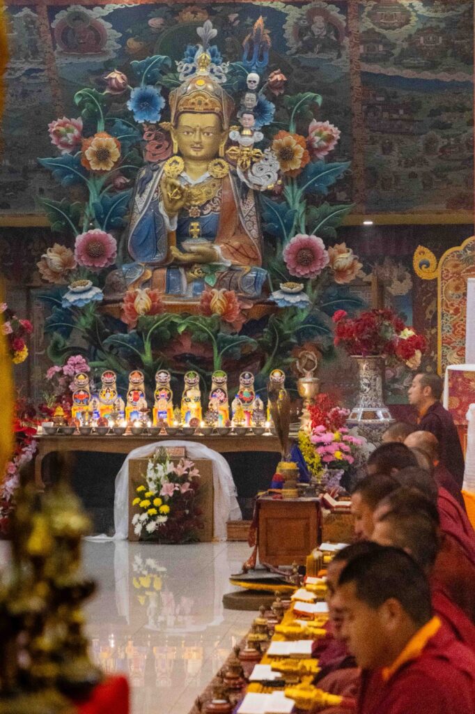 On the 10th day of the first lunar month, Mindrolling Monastery began the annual seven-day drubchen of Thug Je Chenpo, the Great Compassionate One. This profound and extensive mahasadhana was discovered by the founder of Mindrolling, Rigdzin Terdag Lingpa in 1680, and it has been kept as one of the most sacred and important practices in the Mindrolling tradition. This drubchen is held annually during the month of Chötrul Duchen, the Buddha’s Month of Miracles, to mark the parinirvana of Kyabje Minling Trichen. Remembering the limitless compassionate activity of this great master, the merit gathered in this drubchen is dedicated to the long life of the gurus, the flourishing of Dharma and the liberation of all sentient beings. On the final day of the drubchen, the local community gathered to receive the siddhis and blessings of this practice, and it was a wonderful celebration of merit and wisdom for all. Having performed this practice with pure motivation of devotion and bodhicitta, may the merit reach all beings in the three worlds and may it be the cause for all beings to attain perfect Buddhahood.
