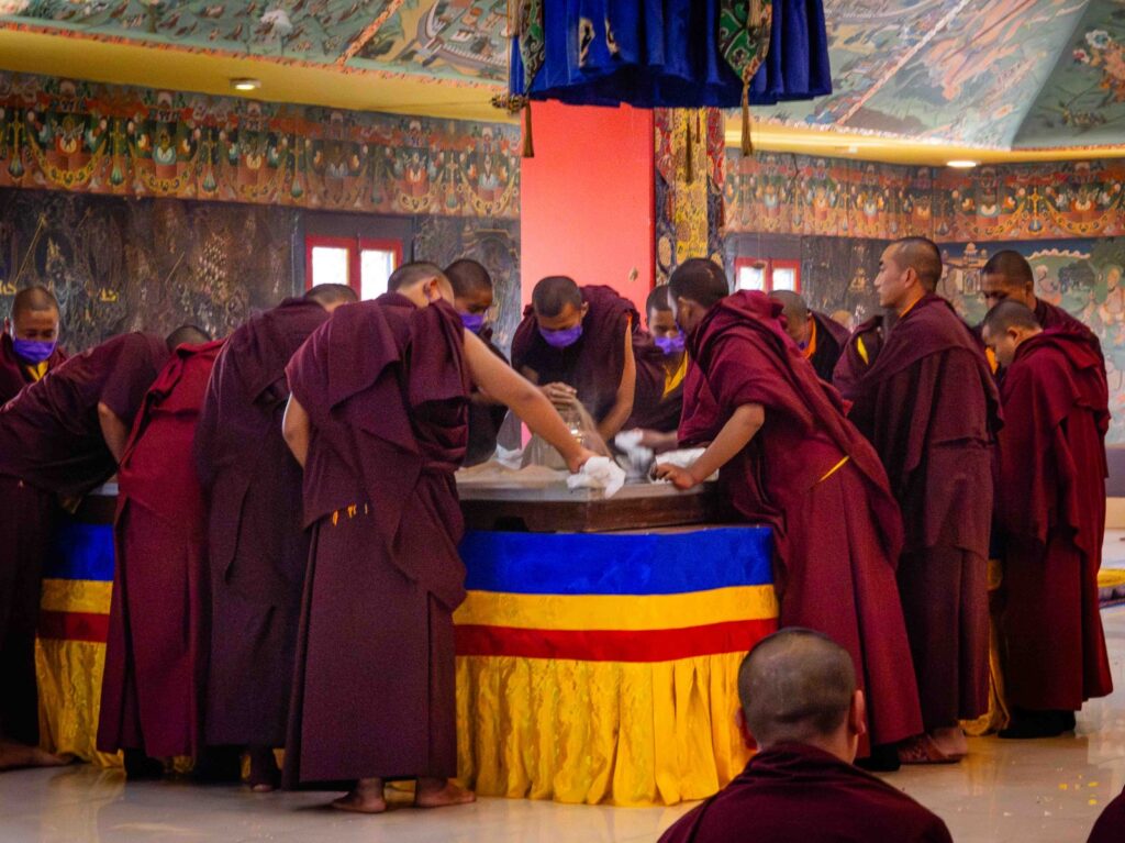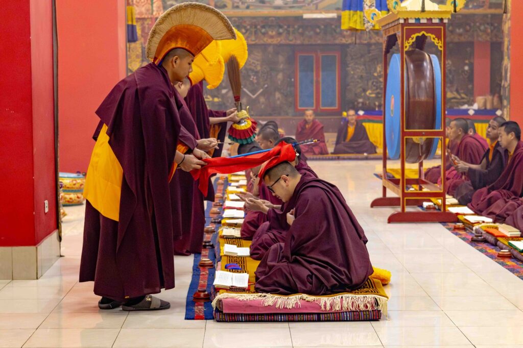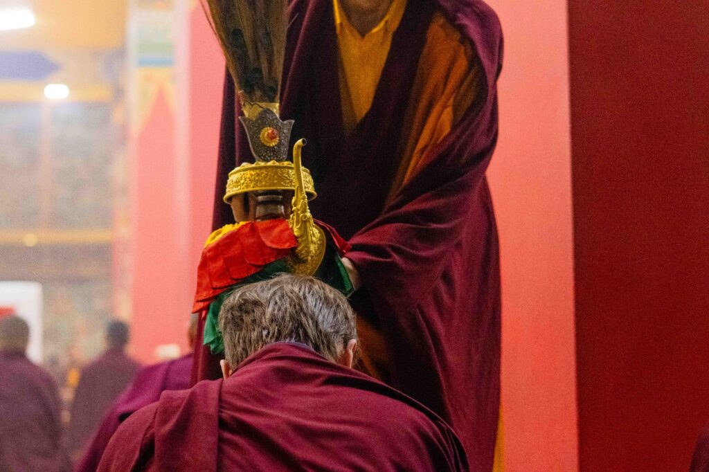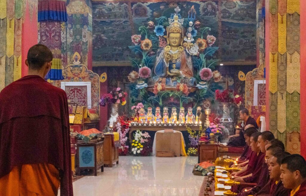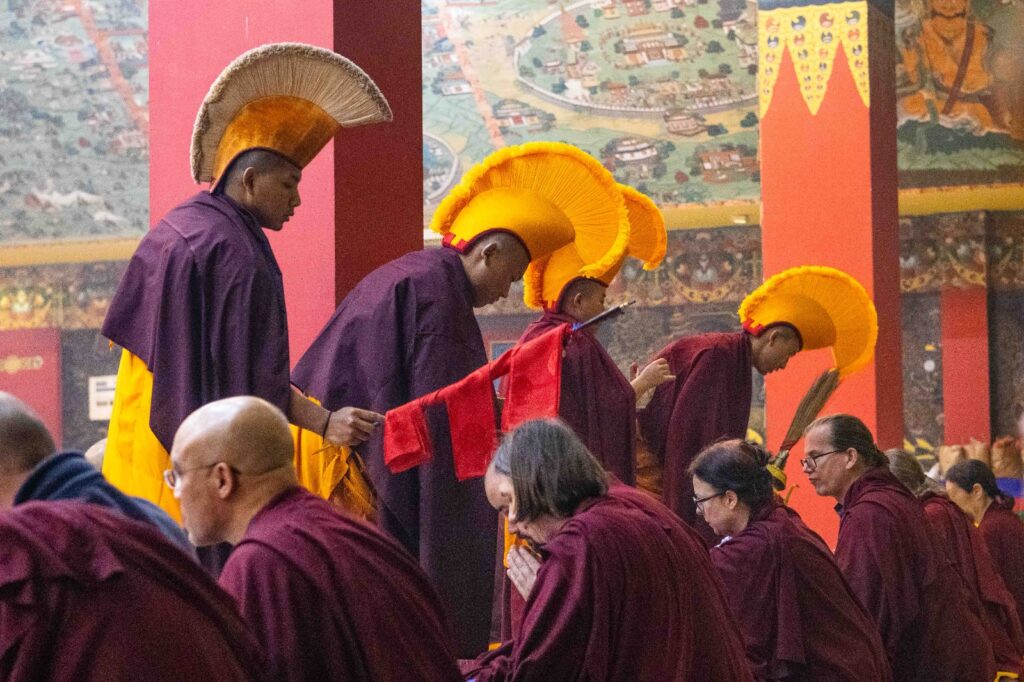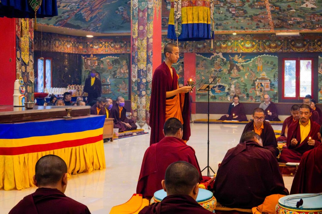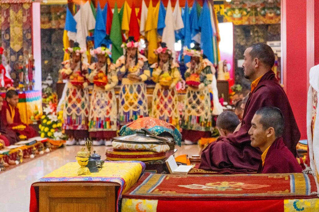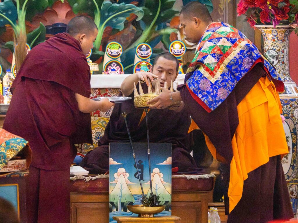 On the 10th day of the first lunar month, Mindrolling Monastery began the annual seven-day drubchen of Thug Je Chenpo, the Great Compassionate One. This profound and extensive mahasadhana was discovered by the founder of Mindrolling, Rigdzin Terdag Lingpa in 1680, and it has been kept as one of the most sacred and important practices in the Mindrolling tradition. This drubchen is held annually during the month of Chötrul Duchen, the Buddha’s Month of Miracles, to mark the parinirvana of Kyabje Minling Trichen. Remembering the limitless compassionate activity of this great master, the merit gathered in this drubchen is dedicated to the long life of the gurus, the flourishing of Dharma and the liberation of all sentient beings. On the final day of the drubchen, the local community gathered to receive the siddhis and blessings of this practice, and it was a wonderful celebration of merit and wisdom for all. Having performed this practice with pure motivation of devotion and bodhicitta, may the merit reach all beings in the three worlds and may it be the cause for all beings to attain perfect Buddhahood.