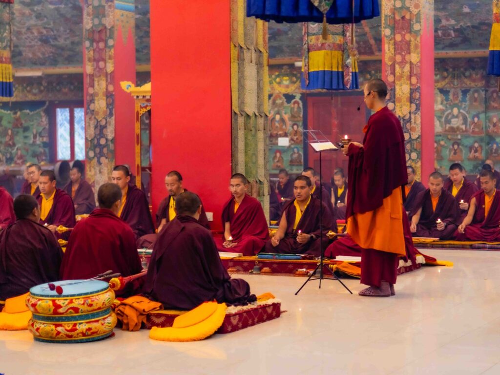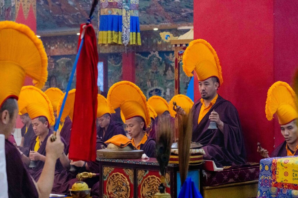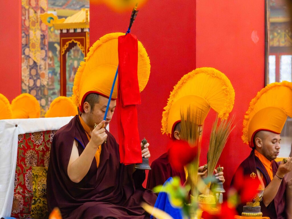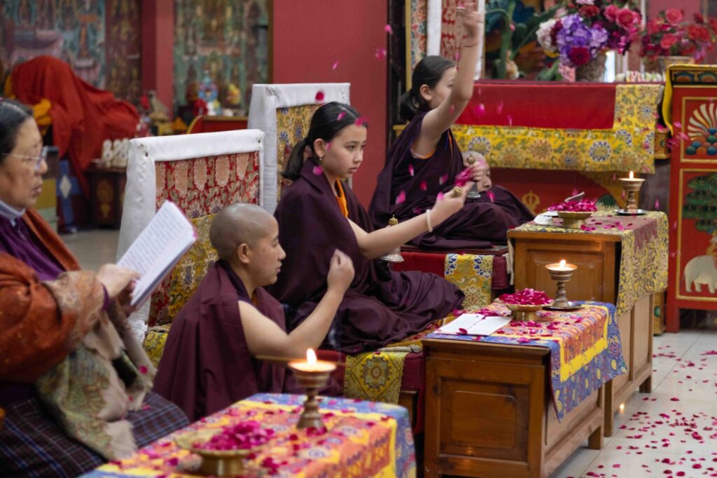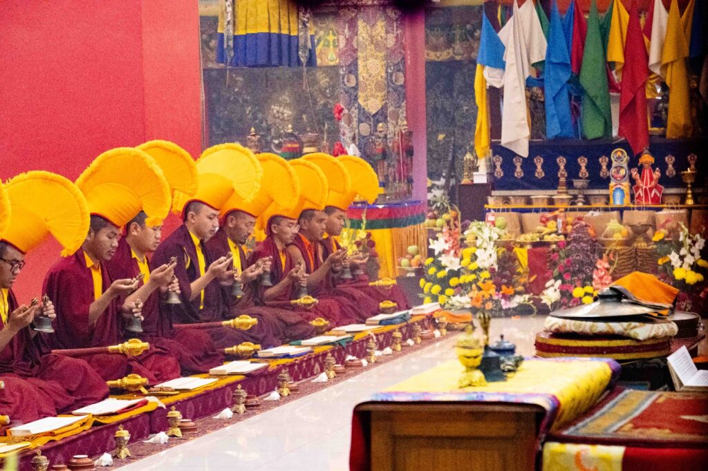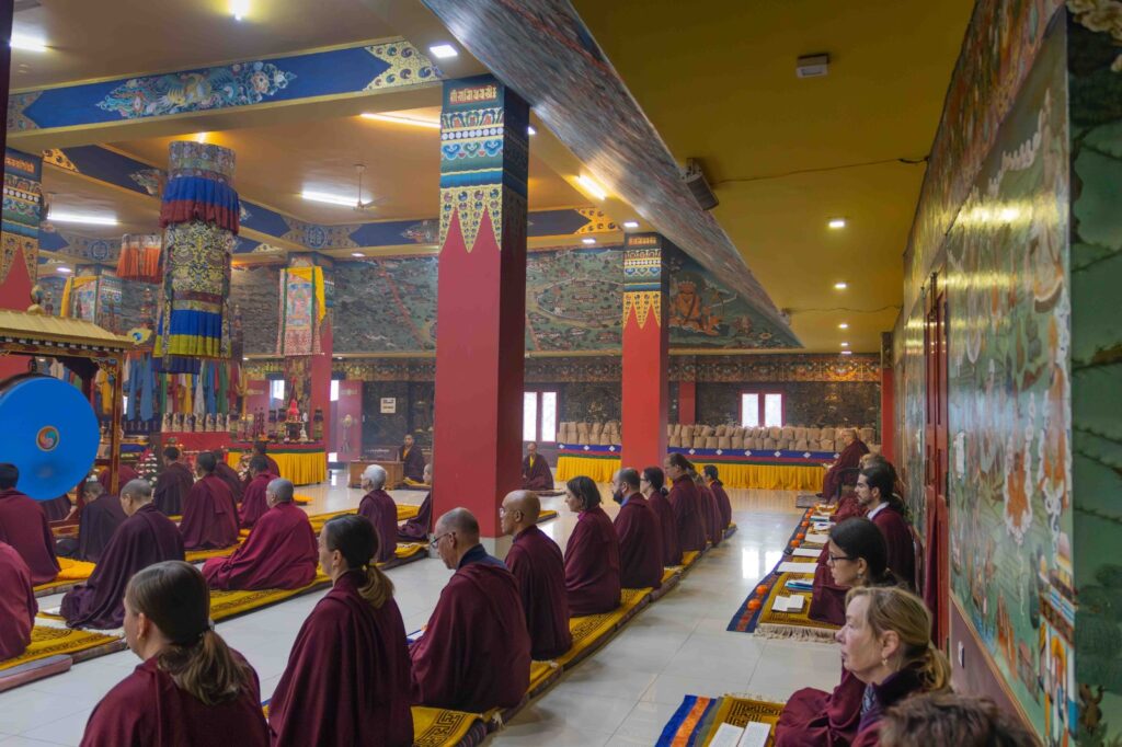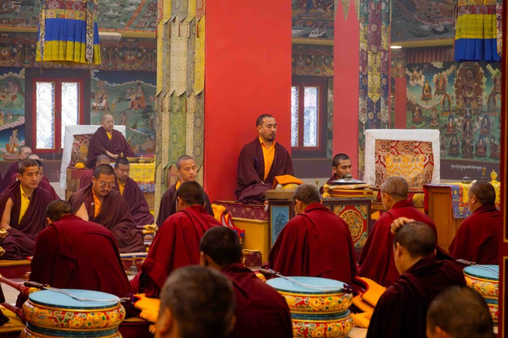 On the 10th day of the first lunar month, Mindrolling Monastery began the annual seven-day drubchen of Thug Je Chenpo, the Great Compassionate One. This profound and extensive mahasadhana was discovered by the founder of Mindrolling, Rigdzin Terdag Lingpa in 1680, and it has been kept as one of the most sacred and important practices in the Mindrolling tradition. This drubchen is held annually during the month of Chötrul Duchen, the Buddha’s Month of Miracles, to mark the parinirvana of Kyabje Minling Trichen. Remembering the limitless compassionate activity of this great master, the merit gathered in this drubchen is dedicated to the long life of the gurus, the flourishing of Dharma and the liberation of all sentient beings. On the final day of the drubchen, the local community gathered to receive the siddhis and blessings of this practice, and it was a wonderful celebration of merit and wisdom for all. Having performed this practice with pure motivation of devotion and bodhicitta, may the merit reach all beings in the three worlds and may it be the cause for all beings to attain perfect Buddhahood.